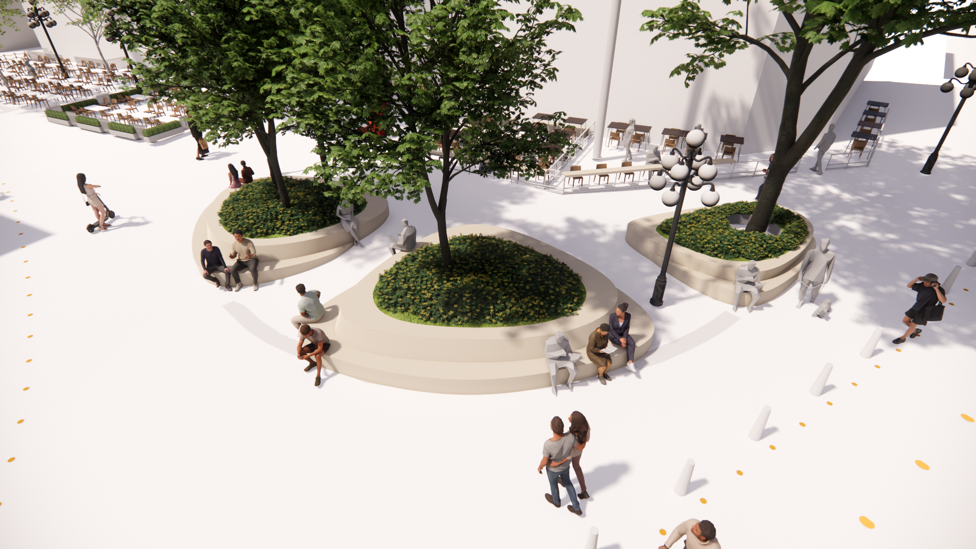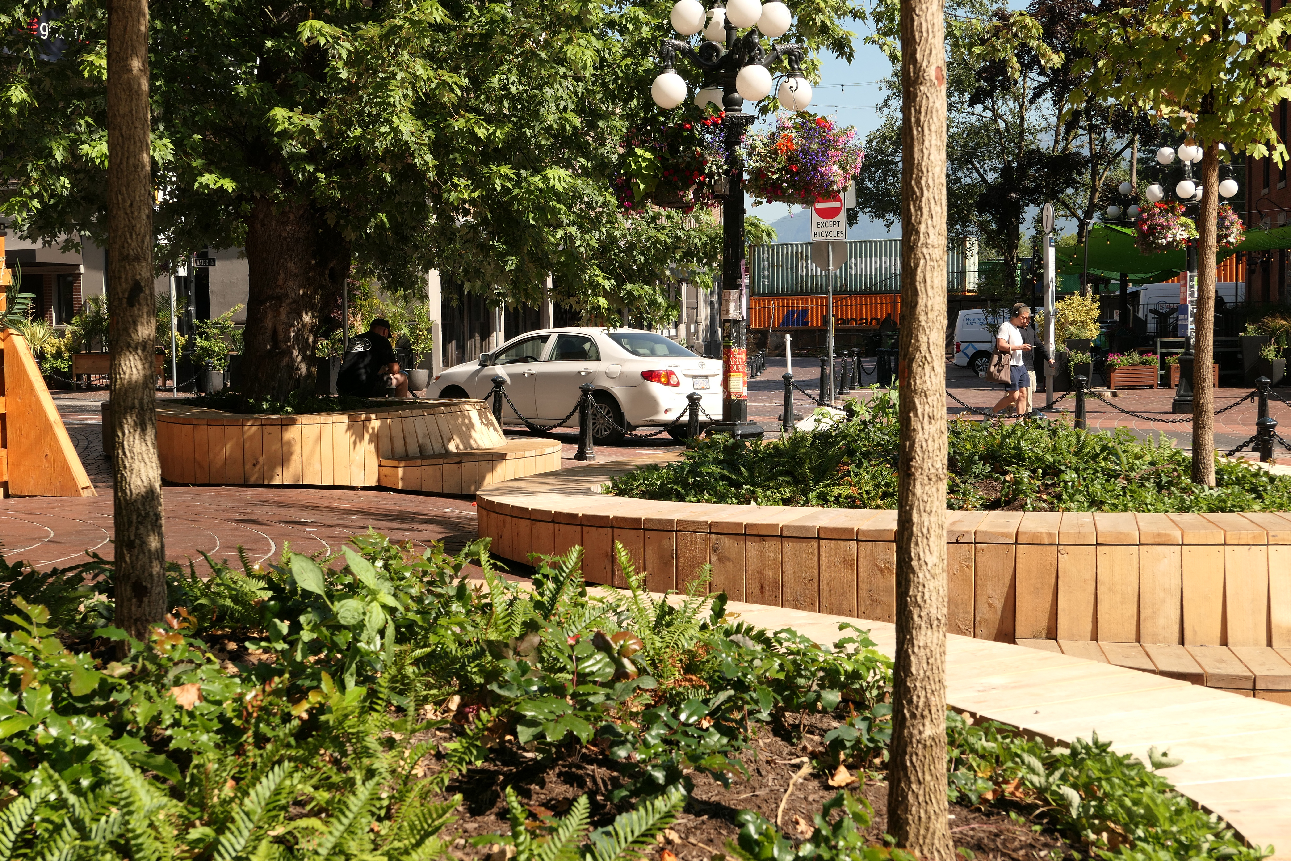 At the heart of Gastown, our design for Maple Tree Square amplifies the spirit of place. Drawing inspiration from the site’s Indigenous origins — ləql’əqi (“grove of beautiful trees”) and qəəmqəəəmələəp (“place of maples”) — the reimagined square centers around memory, movement, and gathering. Three sculptural wood seating elements, each housing a native maple tree and lush planting, anchor the central mound while preserving views to the iconic Flatiron Building. These elements integrate with surrounding patios and help transform the space into a welcoming public node.