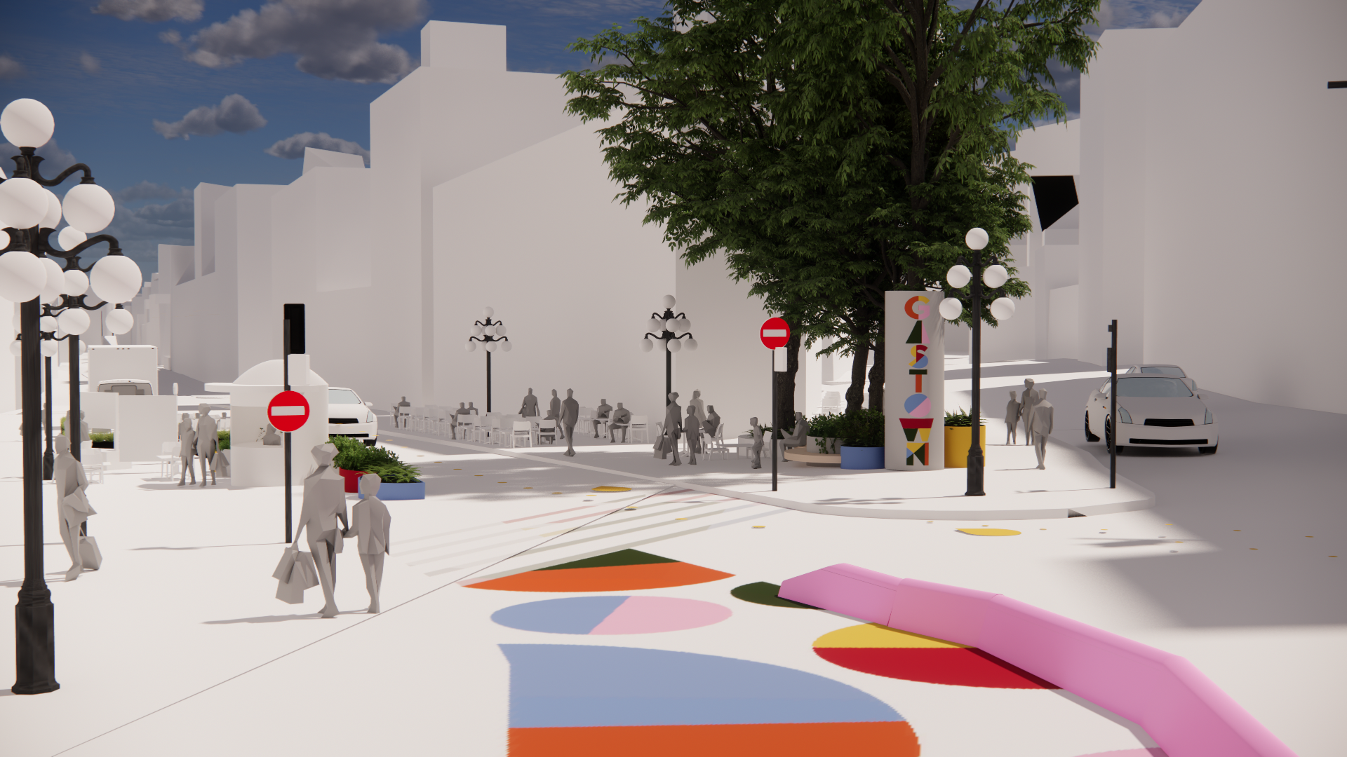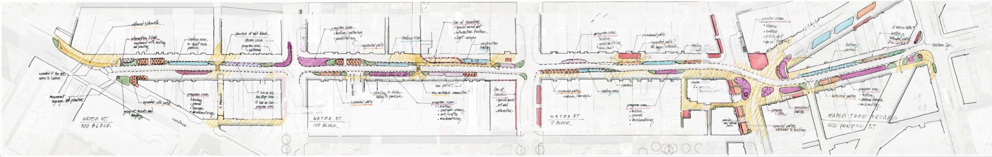 Moving east along Water Street, the streetscape comes alive with vibrant planters, indigenous artwork, public site furnishings, and open zones for pop-up games, markets, and outdoor dining. Painted white street circles help delineate pathways for pedestrians, cyclists, and vehicles, enhancing safety and encouraging active mobility. Each block is designed to respond to the adjacent context, carefully balancing the needs of businesses, movement corridors, and open space opportunities.