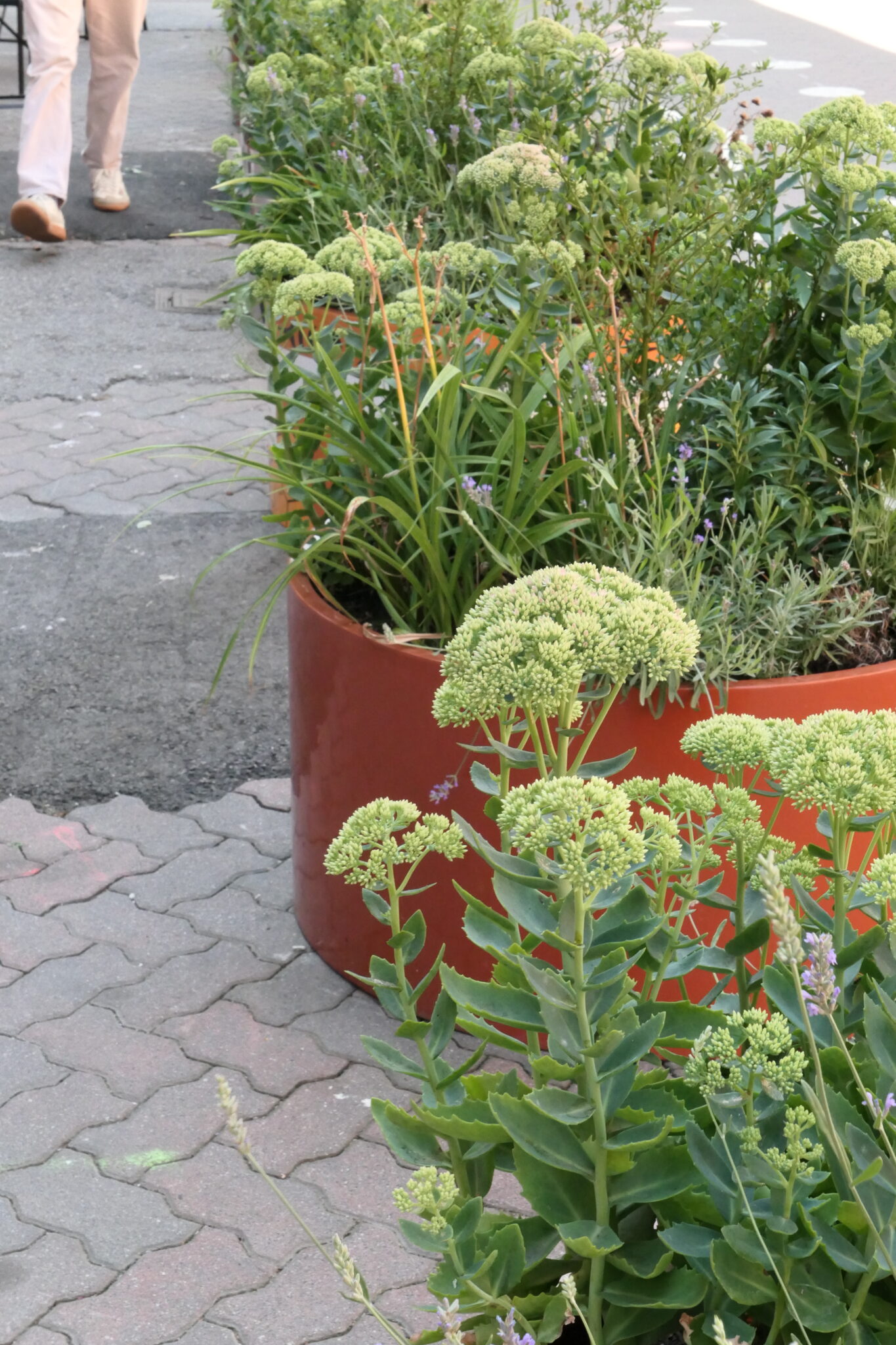 Starting from the western edge of Water Street, a cluster of prominent planters and custom wood benches marks the gateway into Gastown. This entrance feature invites visitors in, while offering a place to pause and gather. The planters — filled with native species — not only introduce a lush streetscape but also establish a cohesive planting language that continues throughout the Water Street corridor.