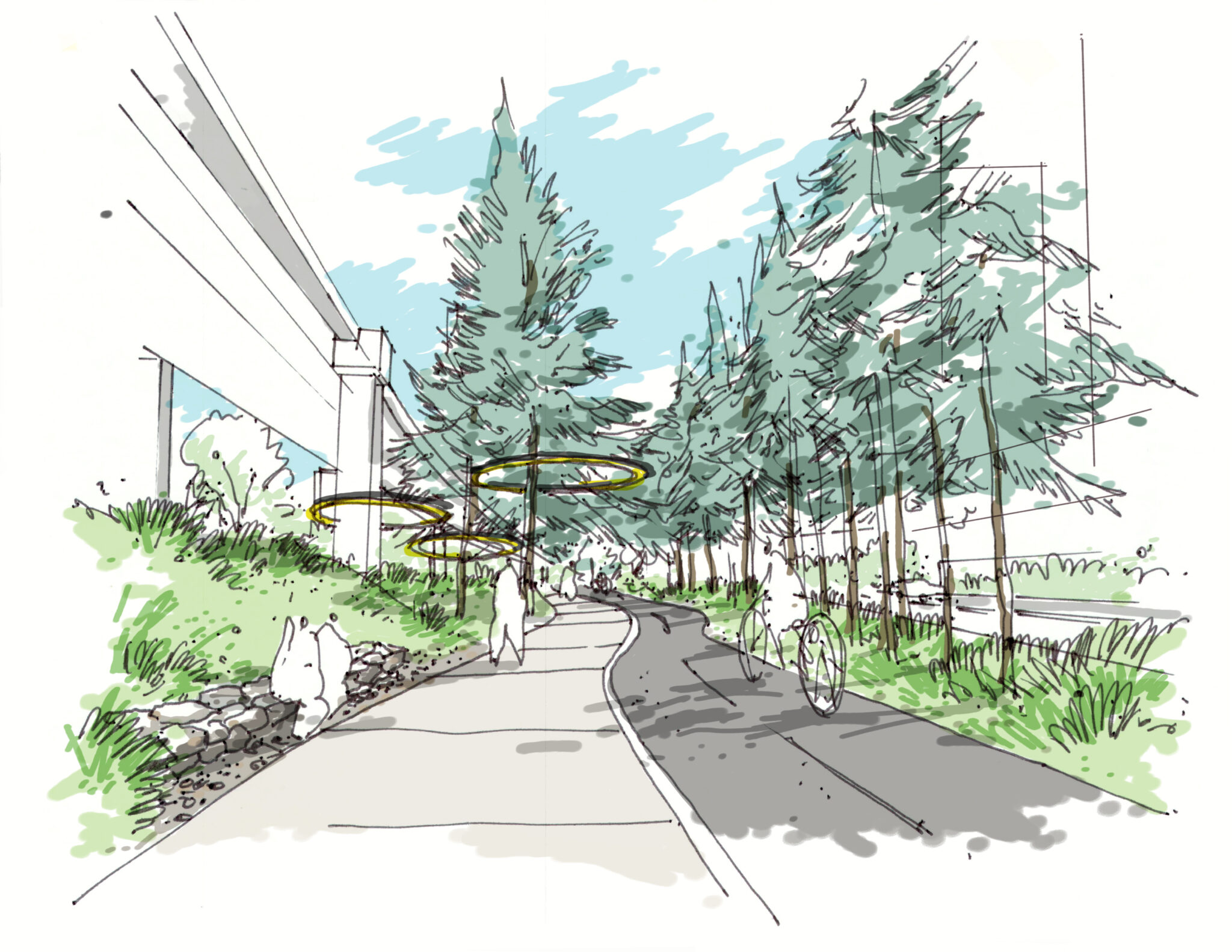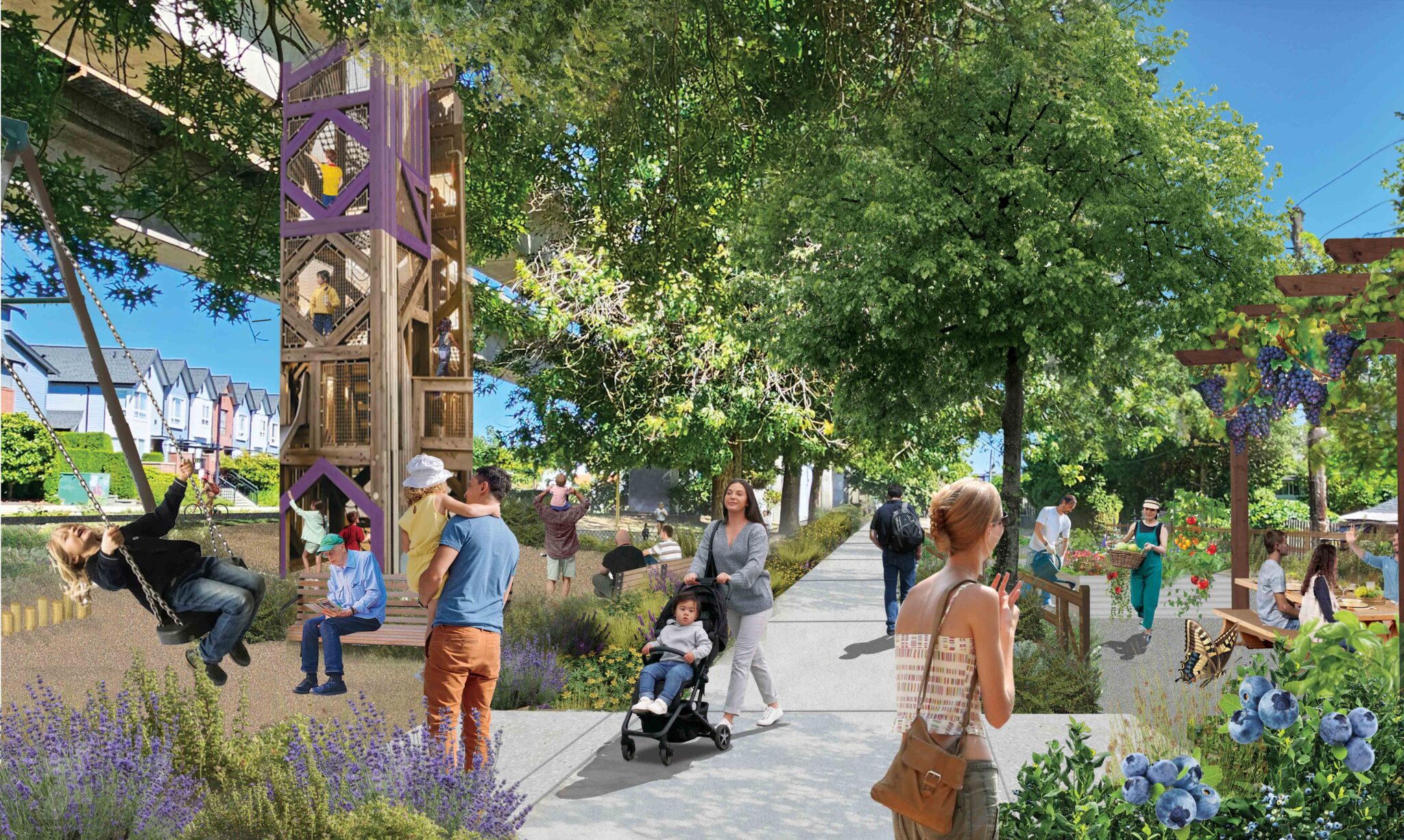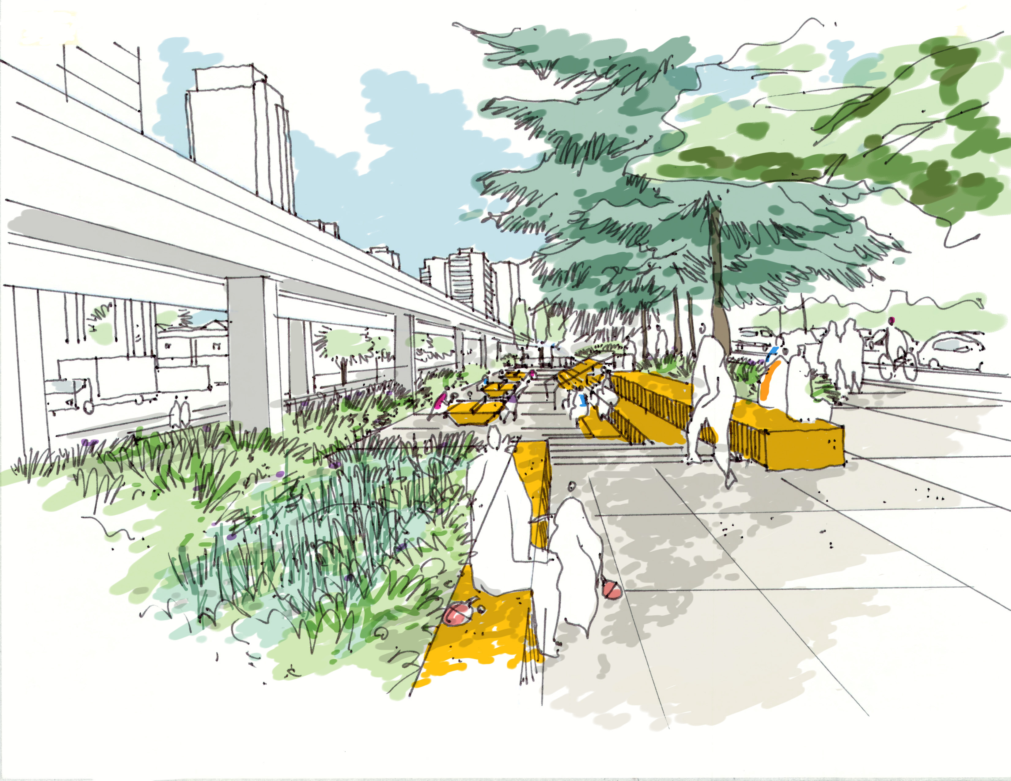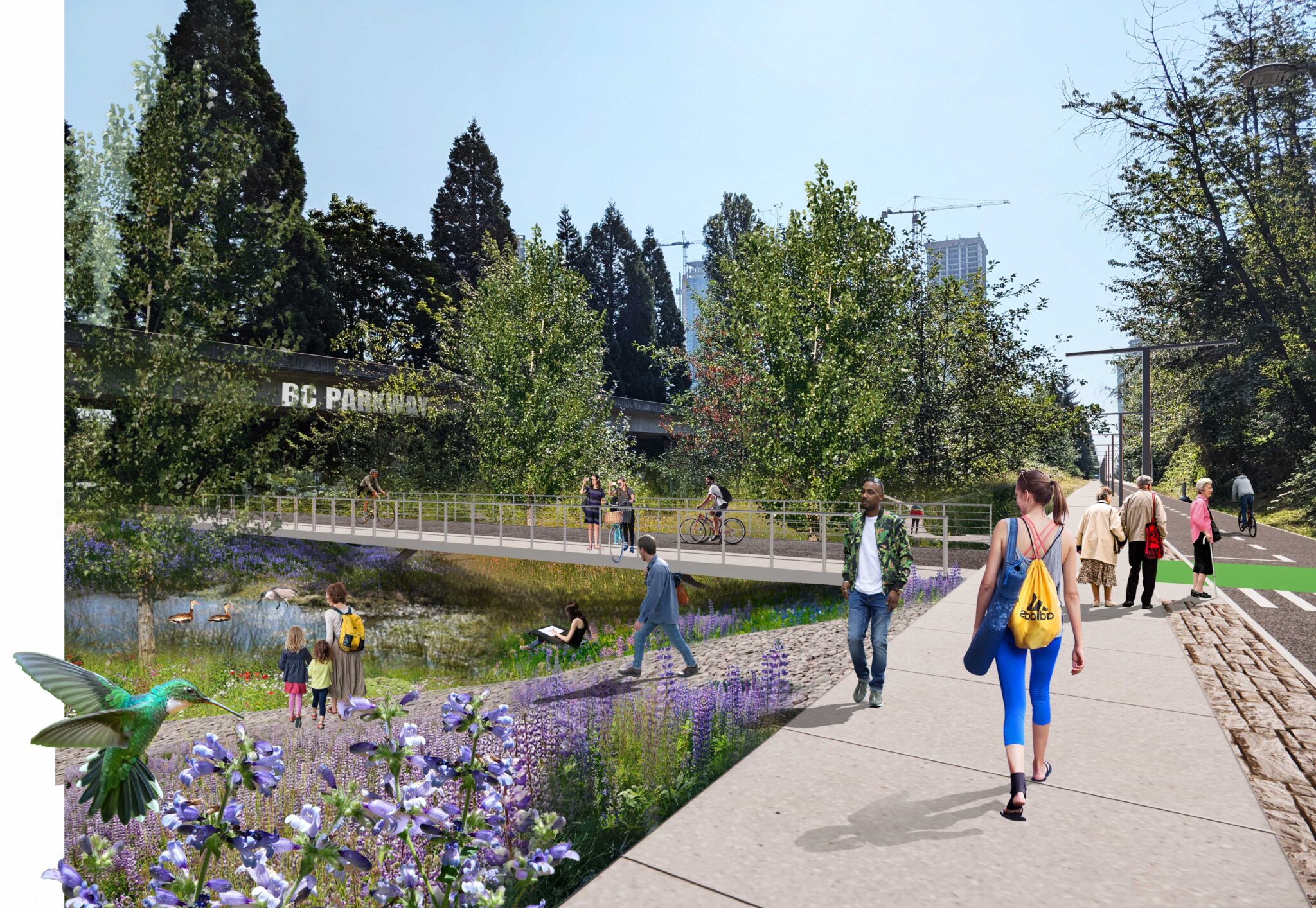 The BC Parkway Enhancement project focuses on a 30-m right-of-way corridor in the City of Burnaby from Boundary Road to Royal Oak SkyTrain station. The corridor is highly underutilized today, with underground utility barriers and safety concerns from the public. The aspiration is to transform the Parkway into a lively linear park with new opportunities for recreation, lounging, socializing and events, serving the needs of the community and responding to the objectives set out in the Metrotown Downtown Plan. Hapa Collaborative was hired to create a long-term Framework Plan for the corridor and lead the efforts in a cohesive, implementable vision, supported by subconsultants to review the ecological and infrastructure layers, as well as the visual branding component.