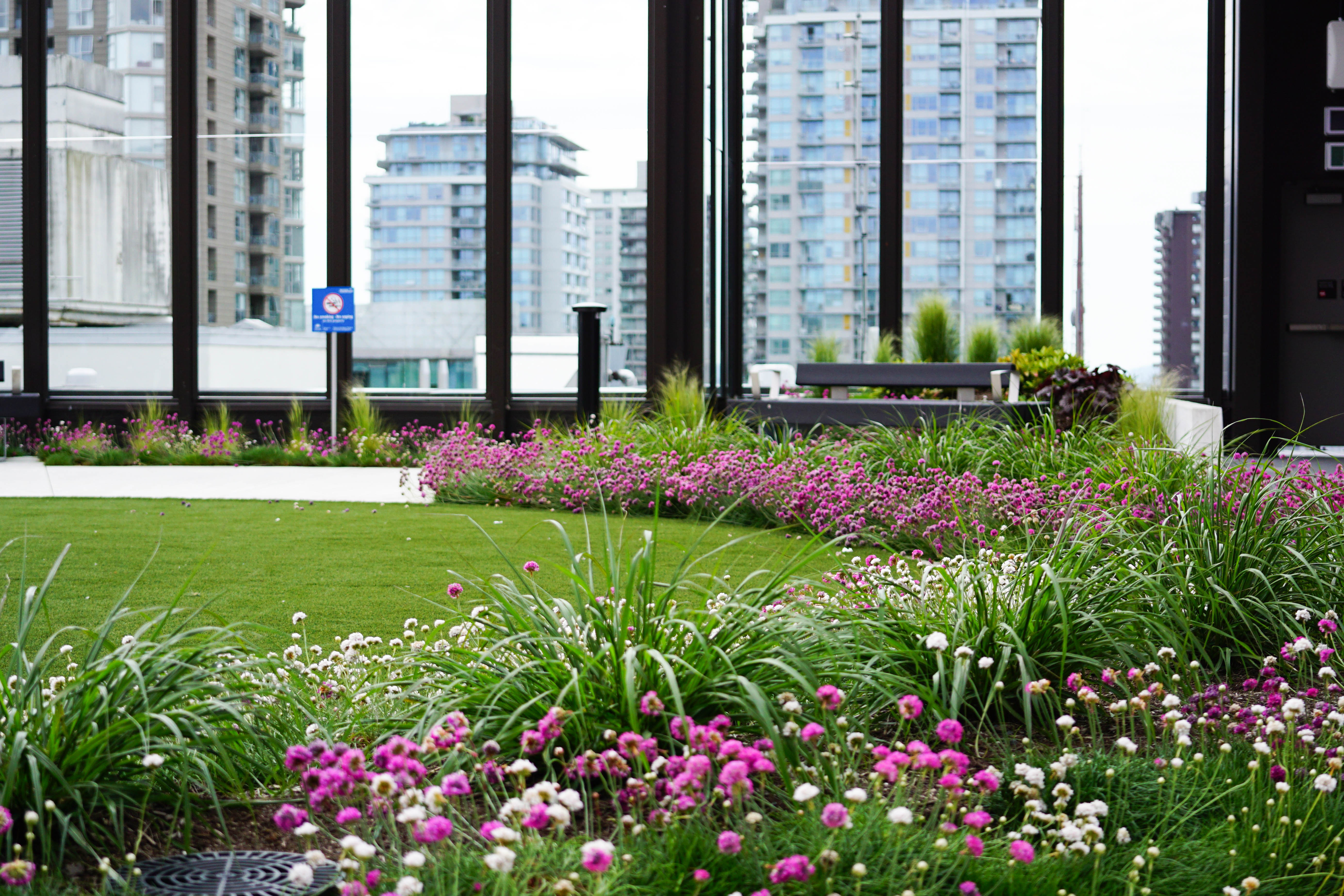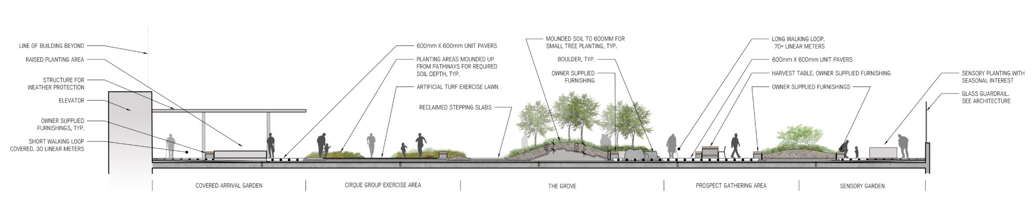 The landscape design brings unity to the building massing and site, taking inspiration from the local context within the North Shore mountains. Intuitive wayfinding and looping pathways lead through a series of gardens each with their own character and features, cultivating curiosity and fostering moments of delight and discovery. A careful selection of indigenous plantings, accented with seasonal interest feature plantings, provides an ever-engaging and seasonally dynamic palette to explore.