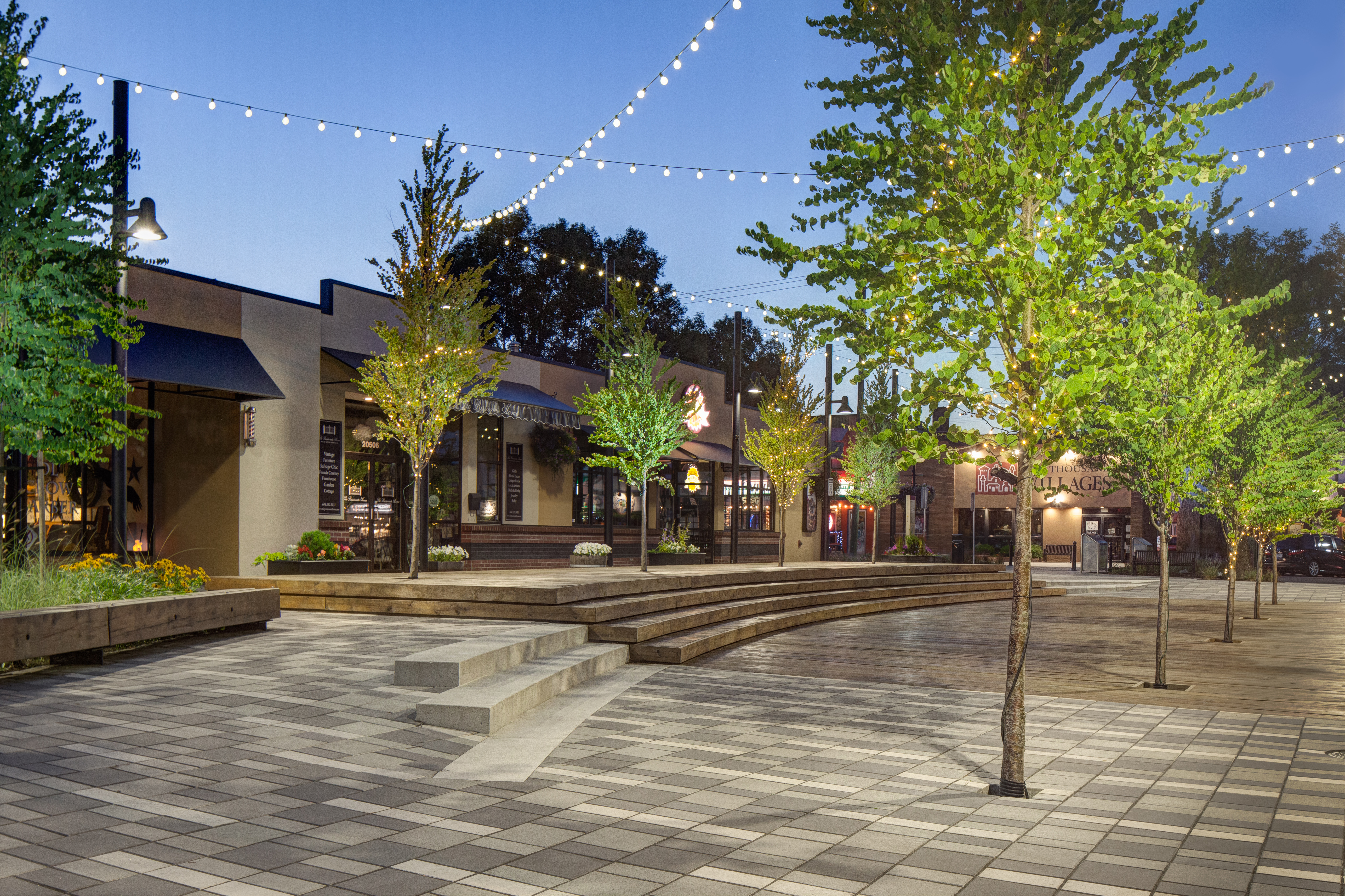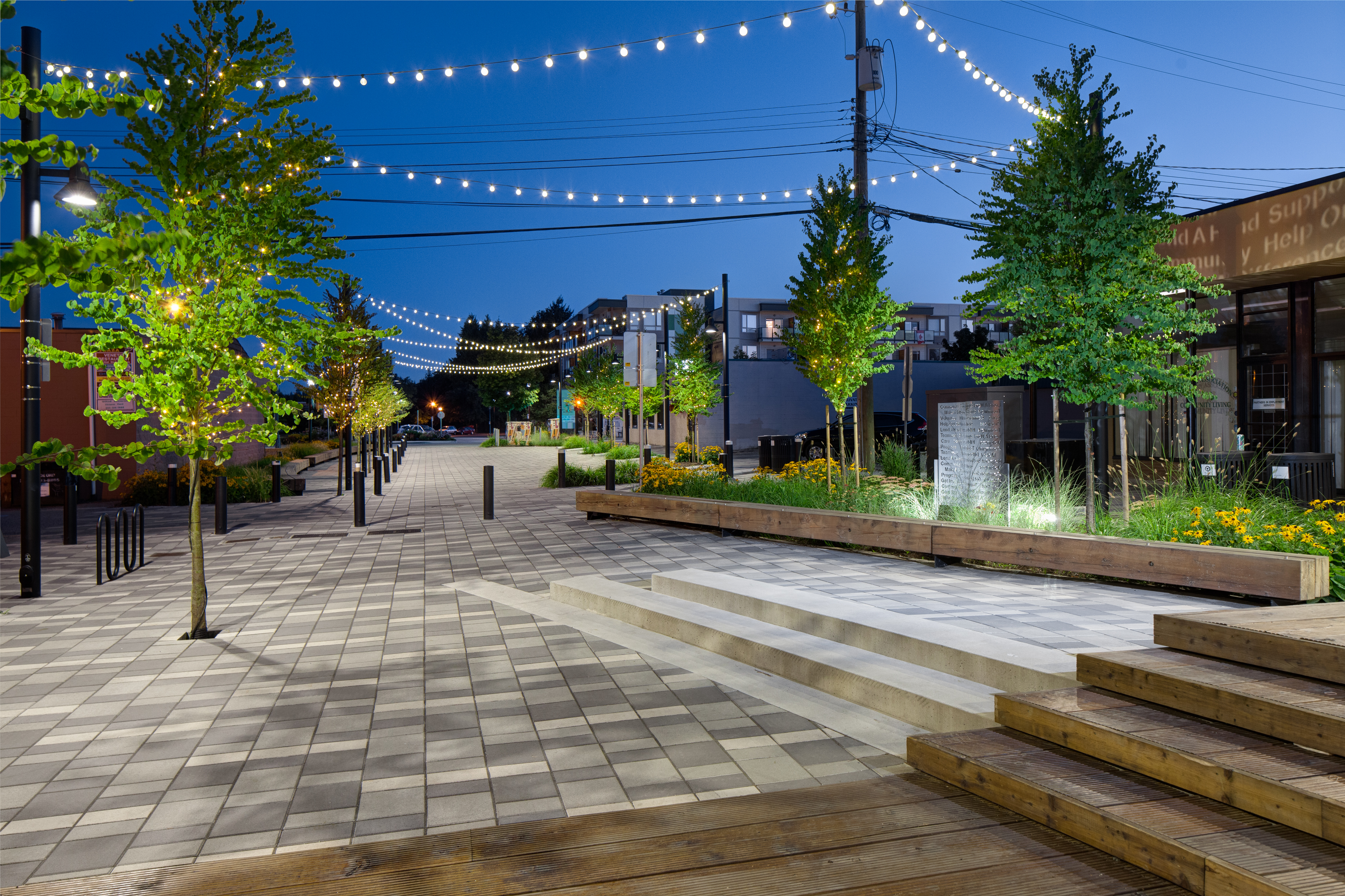 Connecting the historic downtown Fraser Highway to the new Douglas Park amphitheater and cenotaph, the design includes a series of arching benches, stairs and planted masses that frame new social spaces in the middle of the lane. These spaces include a raised middle wood deck for performances and events. The project also coordinated with street parking modifications that eliminates 26 stalls of parking from the lane, incorporates more angle parking on adjacent Douglas Crescent, and reinforces the entire lane as a pedestrian only public space.